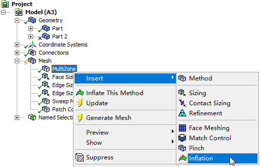 鼠标右键选择模型树节点Mesh > MultiZone,选择菜单Insert→Inflation