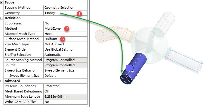 在本案例中,采用的网格方法包括MultiZone、Sweep、Patch comforming Tetrahedrons等,采用的局部参数包括边尺寸与面尺寸。