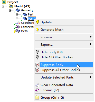右键选择模型树节点Geometry > Part 2,选择菜单Suppress Body