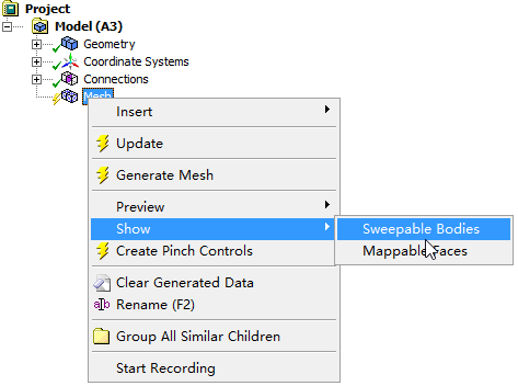 右键选择模型树节点Mesh,选择菜单Show → Sweepable Bodies