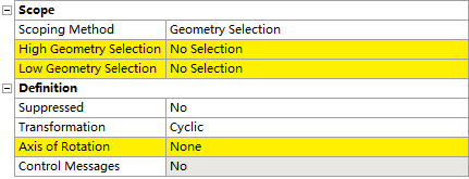 下图所示为选中周期所需要设置的参数,除了要设置两个周期面外,还需要选择Transformation为Cylic,并设置旋转轴Axis of Rotation。
