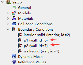 网格导入Fluent后,边界如图所示,可以看到命名的边界被保留下来,记住其id分别为6和7。