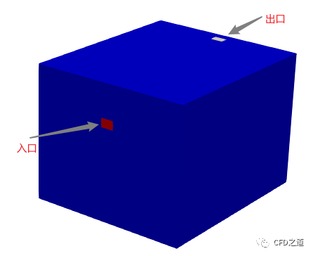 计算模型如下图所示。计算区域内包含一个入口及一个出口,入口流速1.68 m/s,出口静压为0 Pa,计算区域达到稳态后的空气龄分布。
