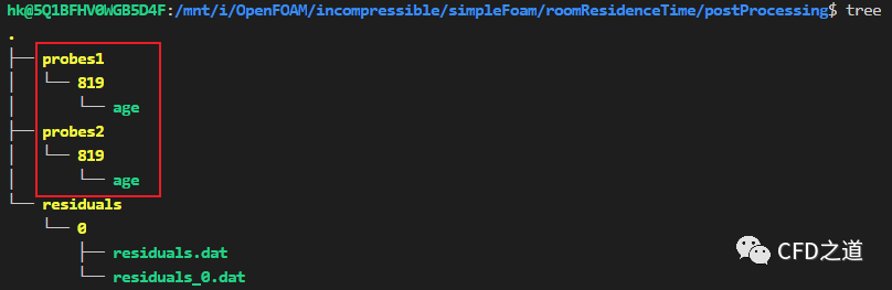 此时在文件夹postProcessing中新增两个文件名分别为probes1、probes2的文件夹,其中放置了获取的age数据。如下图所示。