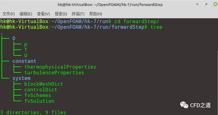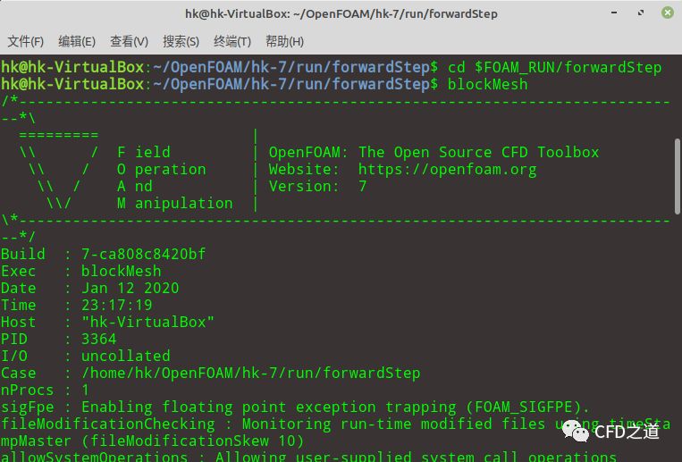 注:图中输入命令时采用了Tab键辅助输入,导致$FOAM_TUTORIALS被自动展开。