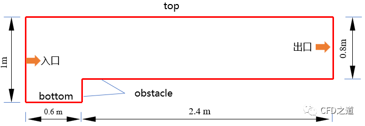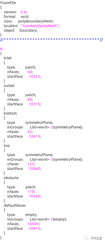 一共包含5个边界,其边界名称分别为inlet、outlet、bottom、top以及obstacle,边界类型分别为:patch、patch、symmetryPlane、symmetryPlane、patch