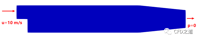本案例计算模型如图所示。计算区域入口速度10 m/s,出口静压0 Pa,其他边界为光滑无滑移壁面。计算流动区域内流场分布。