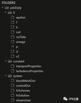 相比较前面的案例,在0文件夹中中多了很多文件,constant文件夹中多了一个turbulenceProperties文件,system文件夹基本没什么变化。
