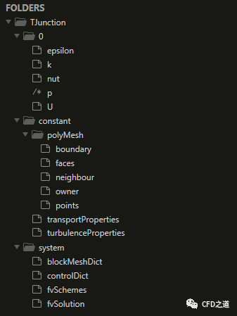本案例采用k-epsilon湍流模型,因此在0文件夹中需要包含文件:k、epsilon及nut。
