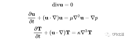 考虑不可压缩粘性流动模型,添加温度场后,其控制方程为: