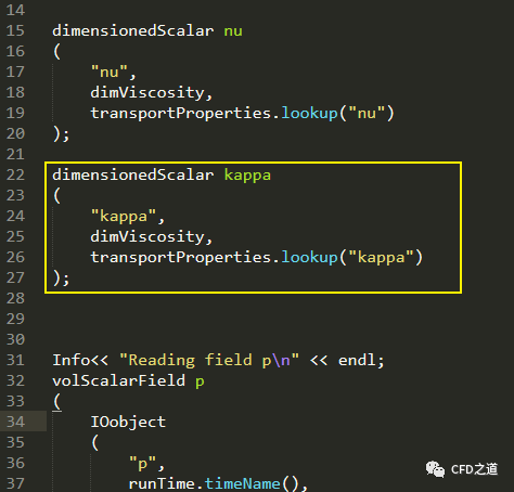 向该文件中添加热传导系数kappa以及温度变量T。利用文本编辑器打开此文件。