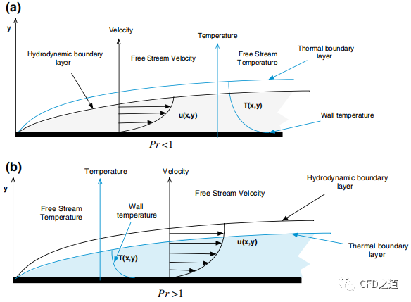 Pr>1,热边界层在流动边界层内部;Pr<1,热边界层在流动边界层外部;Pr=1,热边界层与流动边界层重合。