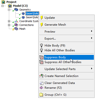鼠标双击C3单元格进入Mesh模块,抑制其中的一个几何,之后进行正常的网格划分及边界命名