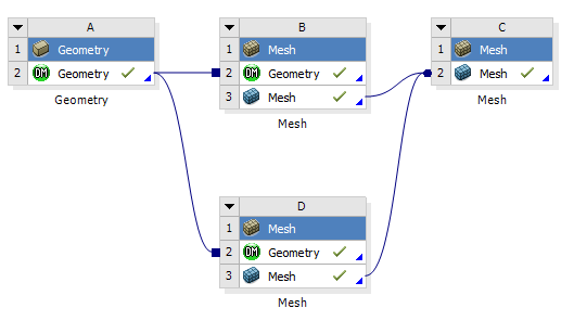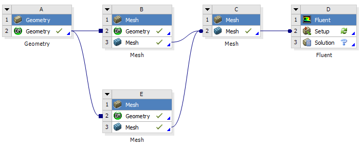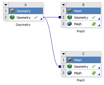 Workbench中拖拽Mesh到工程窗口,并将前面的两个Mesh进行数据连接,如下图中的C模块。更新B3和D3单元格