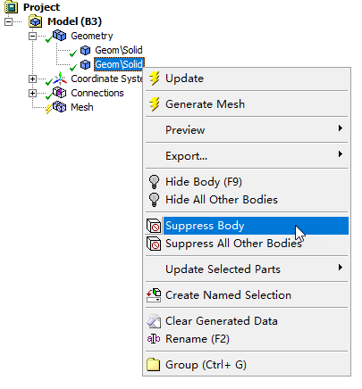鼠标双击B3单元格进入Mesh模块,抑制其中的一个几何,之后进行正常的网格划分及边界命名