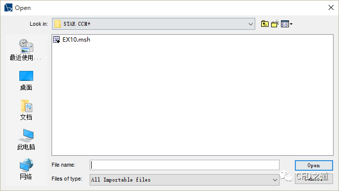 启动STAR CCM+,利用菜单File → Import → Import Volume Mesh...打开文件对话框,读入网格文件Ex10.msh