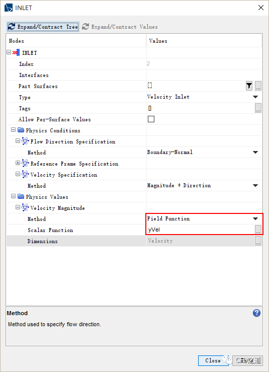 如下图所示设置入口速度Method为Field Function,设置Scalar Function为yVel