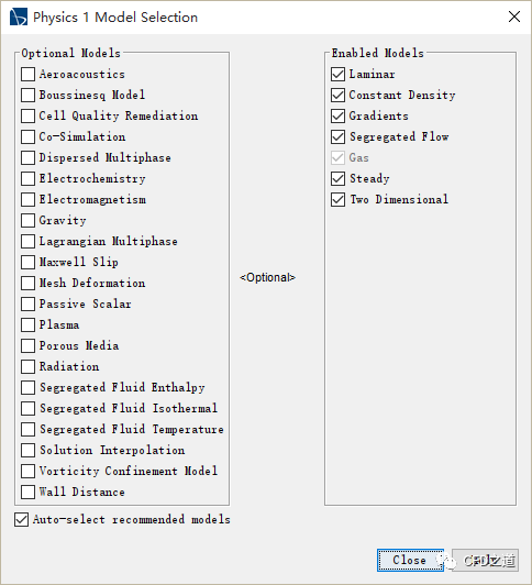 对话框中选择物理模型(Steady、Segregated Flow、Gas、Constant Density、Laminar),如下图所示