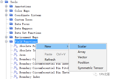 右键选择节点Tools → Field Functions,点击弹出菜单项New → Scalar创建变量yval