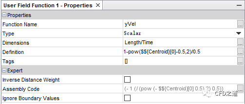 如下图所示,属性窗口中设置Dimension为Length/Time,设置Definition为1-pow($${Centroid}[0]-0.5,2)/0.5