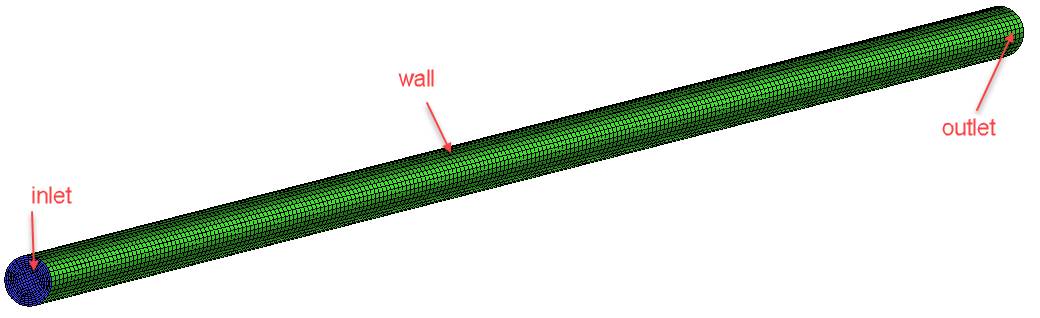几何及网格如图所示。在ICEM CFD中创建几何并划分网格,各边界命名如图所示。生成并输出网格pipe.msh。