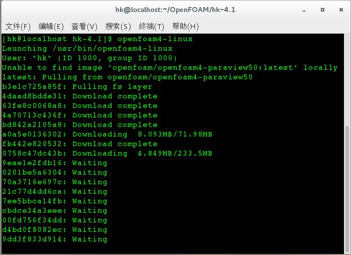 解压完毕后会自动启动Docker,此时可以在里面运行OpenFOAM。