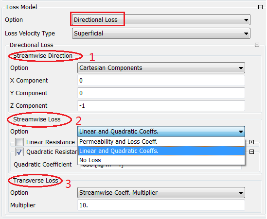 如果选取了Directional Loss损失模型,需要指定Streamwise Direction(指定流向方向)、Streamwise Loss(指定流向损失计算方式)、Transverse Loss(指定横向损失计算方式)。如果需要在指定方向有一定的阻力损耗,在横向上抑制流动,就需要选择Directional Loss。一般用于蜂窝、多孔板等。