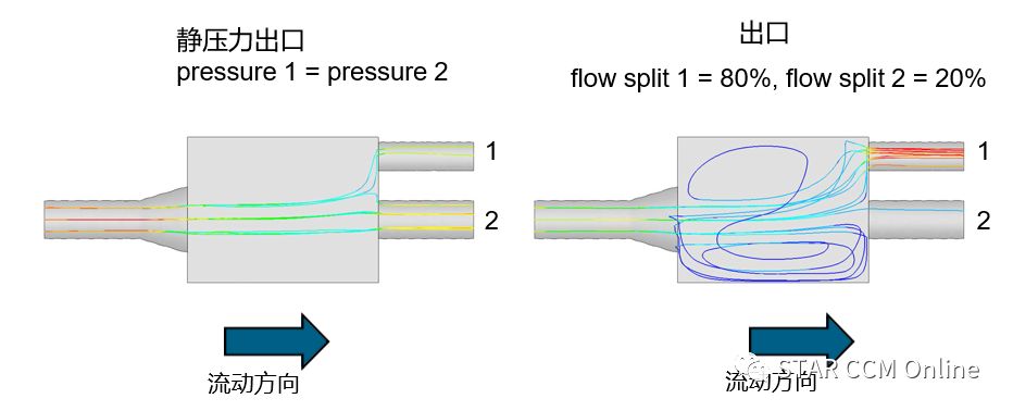 “出口”出口边界条件可以设置不同出口之间的流量的分配比率。不同的的分配比率影响整个流场的分布不同。仍使用第一个案例来说明“出口”边界类型对流场的影响,如下图所示。左图为静压力出口,两出口的背压相同,由于出口管路的内径大小不同造成出口管路的压损不同,内径较小的压损较大流量较小,内径较大的压损较小流量较大。