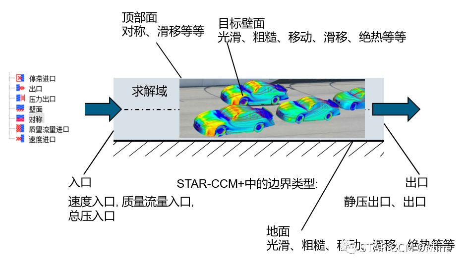 下图是外流场示意图,一般类型的外流场包含了入口、出口和壁面。入口有速度入口、质量流量入口和总压入口;出口有出口和静压出口;目标壁面有光滑壁面、粗糙壁面、移动壁面、绝热壁面等等;地面有光滑壁面、粗糙壁面、移动壁面、绝热壁面等等;顶部面有对称和滑移等。在STARCCM+中使用不同的图标表示出来。