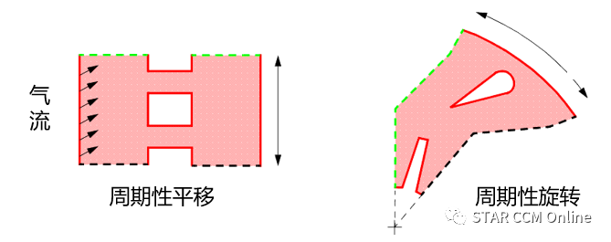 这里还有一种周期性对称结构也属于对称边界的范畴。整个空间可以以某一部分的周期性结构就来描述时,就可以采取这种边界条件。如下图所示绿色与黑色虚线成周期性对称结构。
