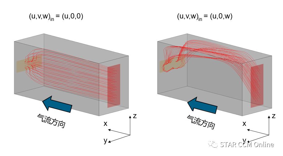 入口边界的气流方向不同对结果影响较大,以一个案例来说明在不同角度下整场的速度分布,如下图。左图为指定X方向的流动,该流动方向与入口边界法向相同,在整个求解域中得到相对均匀的速度场分布。右图为在Z方向上增加了一个速度分量w入口处的气流与入口边界形成一个夹角,气流进入求解域后沿XZ合速度方向流动,受到顶部壁面和出口的共同影响形成拱形的速度流场分布。