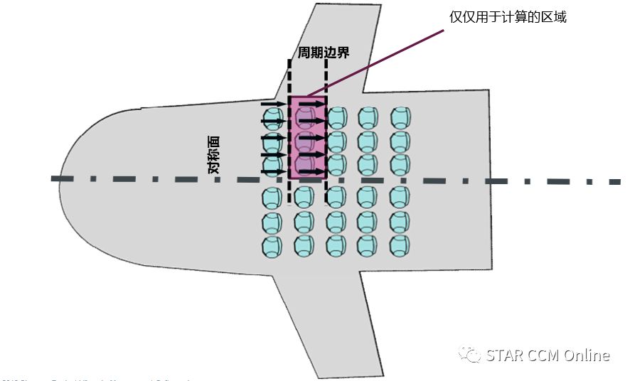 下图飞机乘员舱,只计算一排座椅区域,前后使用周期性边界条件,左右使用对称面边界。