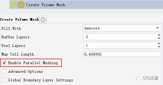 当前版本可以通过激活选项Enable Parallel Meshing以利用并行方式生成hexcore网格