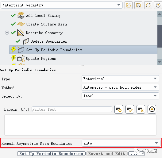 在Set Up Periodic Boundaries节点中可以激活选项Remesh Asymmetric Mesh Boundaries,当周期面中存在不对称网格时自动进行边界网格重构
