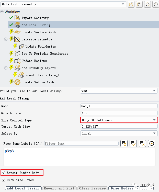在Add Local Sizing任务中,激活选项Repair Body of Influence可以自动封闭初始未完全封闭的BOI几何