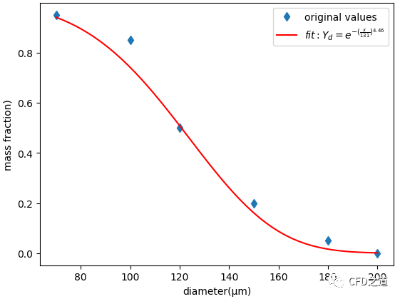 利用Rosin-rammler函数拟合上面的数据。这种非线性估计极为麻烦,曲线拟合常常失败。可以采用python对上表中的数据进行拟合。