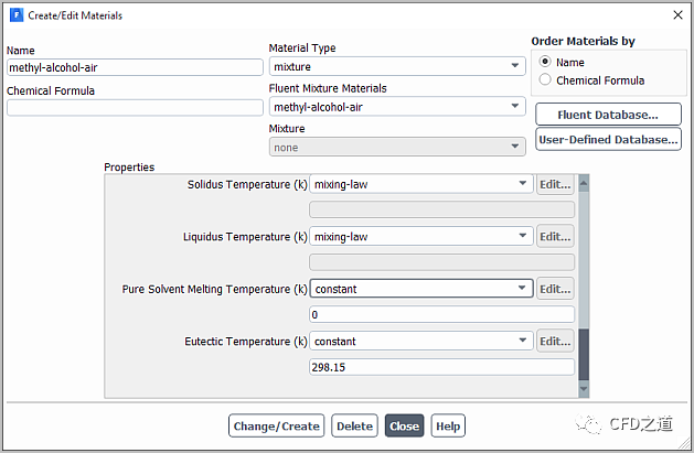 定义混合物时,还需要指定Mass Diffusivity(理论模型中的参数、Eutectic Temperature(理论模型中当参数),Pure Solvent Melting Heat (理论模型中的)及Pure Solvent Melting Temperature(理论模型中的