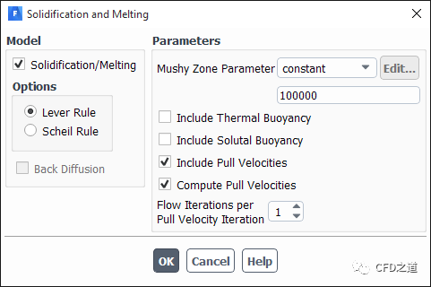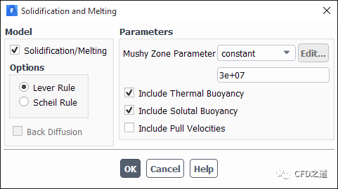 指定模型参数Mushy Zone Parameter,该参数对应着理论模型中的糊状区常数,该参数可以指定为常数,也可以利用UDF宏DEFINE_SOLIDIFICATION_PARAMS进行指定。