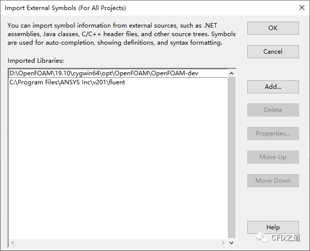 Source Insight(官网地址:https://www.sourceinsight.com/)是一个程序代码编辑器及代码阅览器,不过此软件是一款商业软件,不过某度上也能找到不少可以使用的,建议找4.0以上的版本。软件安装完毕后,第一次启动时软件会弹出Import External Symbols对话框,点击Add…按钮导入源代码所在的路径,如下图所示导入了OpenFOAM及Fluent UDF编写时所需要的源代码。点击OK之后即可。后面再新建源代码即可实现代码提示及代码搜索功能了。