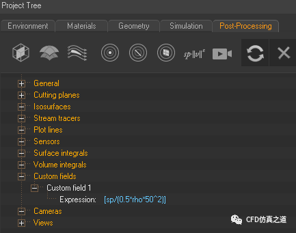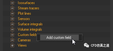进入Post-Processing标签页,右键选择模型树 节点Custom fields,选择弹出菜单Add custom field添加自定义场