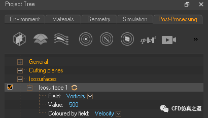 选择Field为Vorticity,设置value为500,设置Coloured by field为Velocity,点击上方的刷新按钮显示等值面