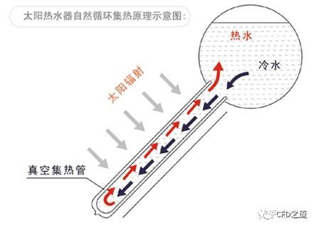 说白了很简单,真空集热管吸收太阳辐射热量加热与之接触的水,水的温度升高,密度降低,从而在水箱与管内实现自然对流。