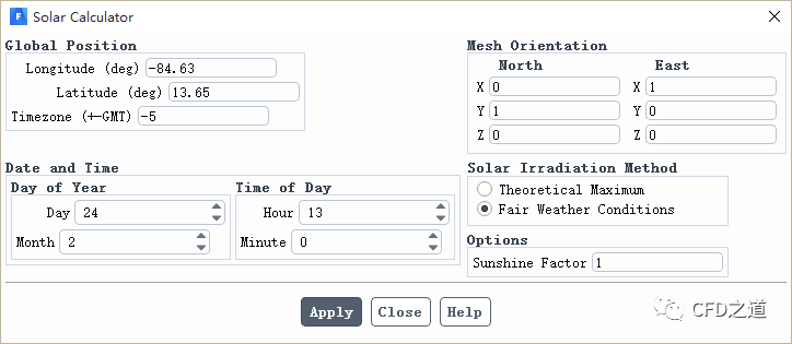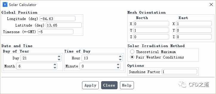 Fluent中的太阳辐射计算器的输入界面是这样的。
