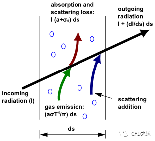总体来讲,辐射能量通过有介质的空间后的能量行为如下图所示(图形来自Fluent Theory Guide 5.3.2),在辐射能量行进过程中,部分能量被介质散射与吸收。