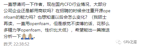 公众号这阵子在推送OpenFOAM方面的文章,有道友在后台留言问关于OpenFOAM的应用问题,如下图所示。