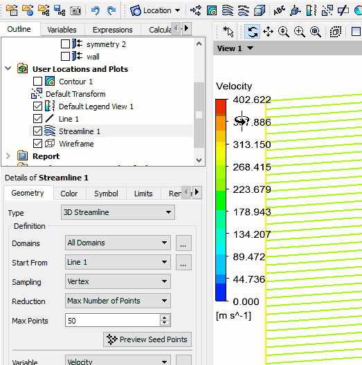 由于本案例计算域过大,如果从入口出发创建流线的话,会影响显示效果。实际上我们只需要关注翼型周围的流线。因此可以在翼型来流前方创建line,然后以此line作为流线的出发位置,即可创建漂亮的流线。