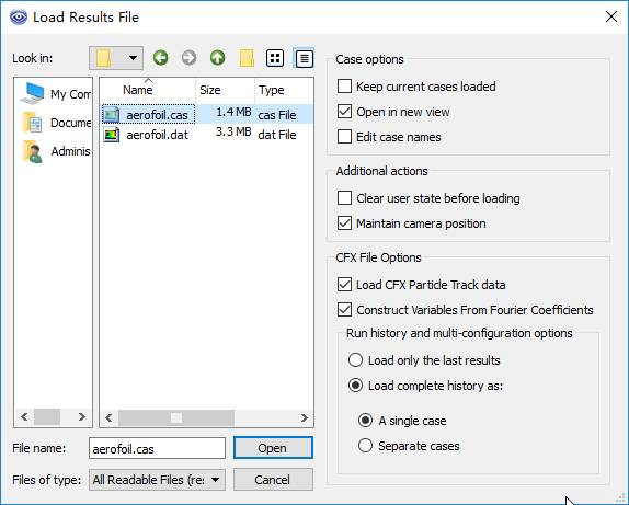 在弹出的文件选择对话框中,选择计算结果文件aerofoil.cas