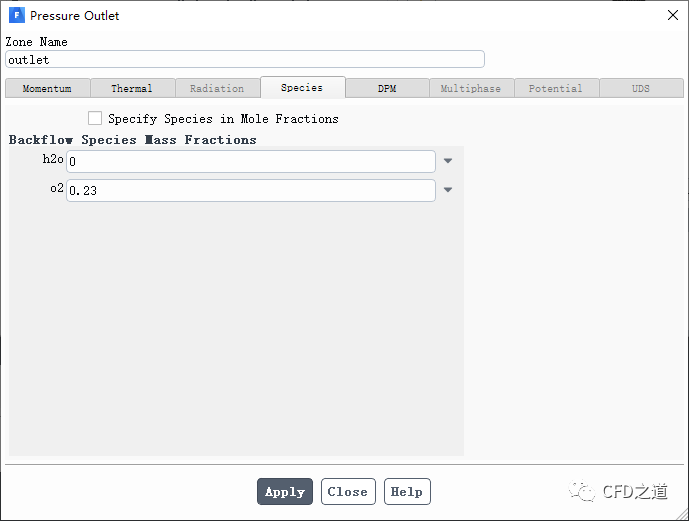指定出口边界 outlet的回流组分O2质量分数为0.23