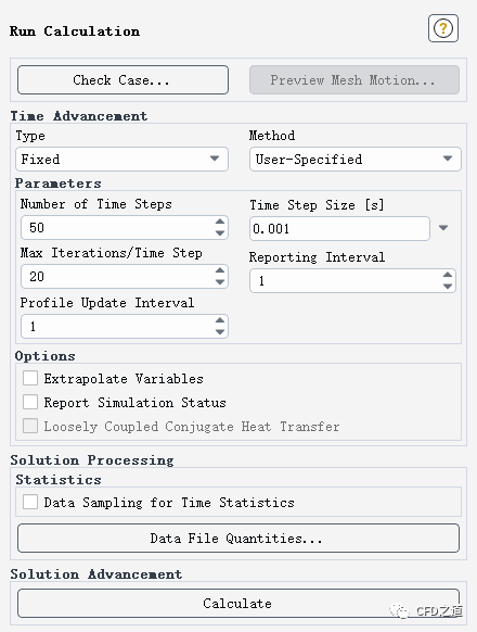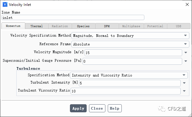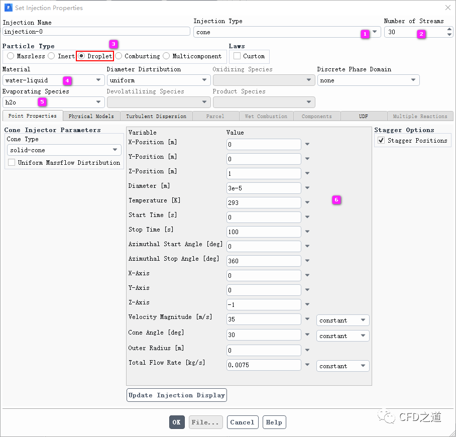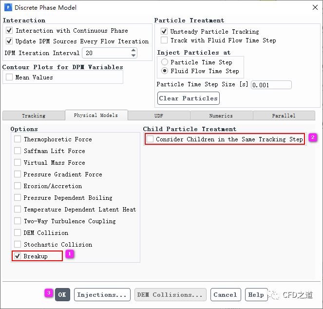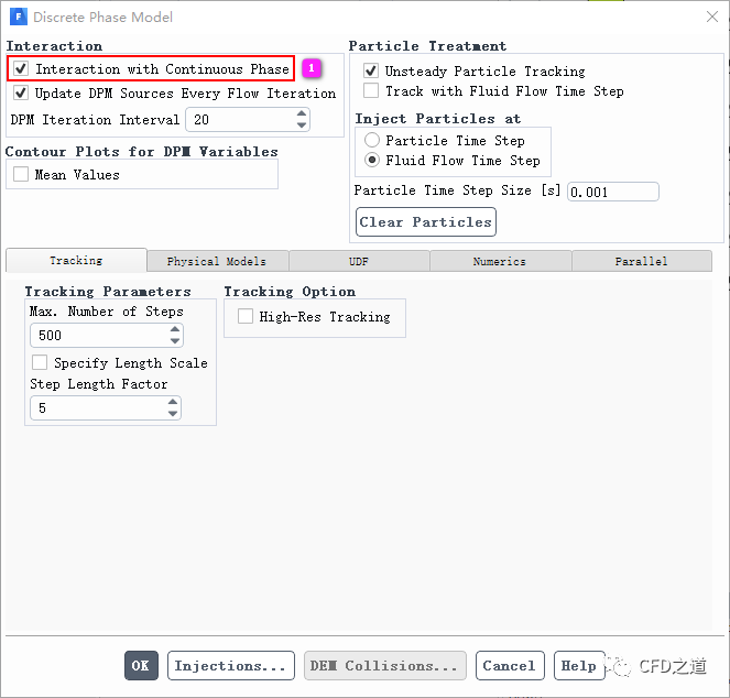 打开 Discrete Phase Model设置对话框,选中选项Interaction with Continuous Phase,其他参数保持默认设置