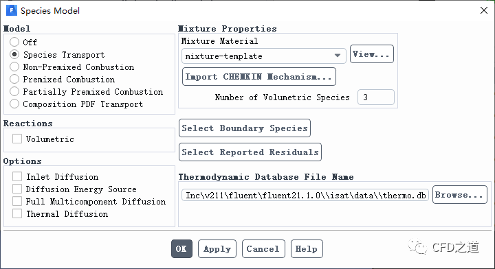 激活使用组分输运方程,选中混合物材料为mixture-template